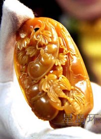 这是福州拍品预展上的大师之作田黄雕件。2004年12月27日,福州西湖大酒店举行2004秋季联合拍卖会拍品预展活动,当今在世最权威的田黄石雕刻家郭懋介大师的得意之作 “桃源洞天”,受到在场“爱石”之士的一致好评,估价80万到85万元人民币。