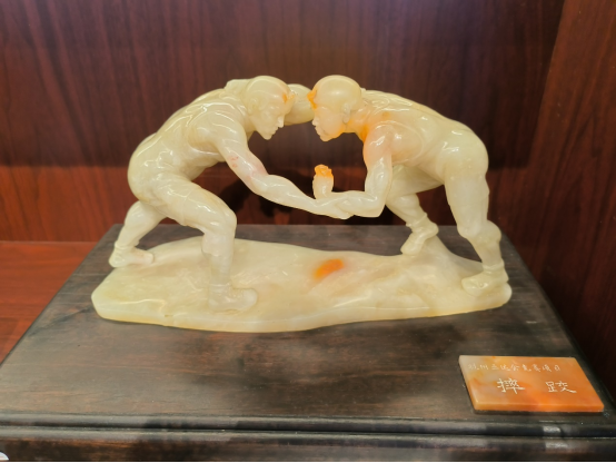 活动现场,国家级非物质文化遗产项目“鸡血石雕”代表性传承人钱高潮所设计创作的“摔跤”和“跆拳道”雕件格外吸睛。据钱高潮介绍,“摔跤”雕件取材于昌化石中的彩冻石,将晶莹剔透的白冻和具备肌肉色彩的黄冻相结合,彰显运动之美。“跆拳道”雕件则采用昌化石中的红花石,展现双方对战、面红耳赤的特殊效果。